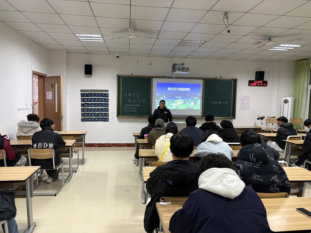 班会伊始,辅导员老师结合学生实际,精准梳理出三类期末高频压力。学业类压力表现为 “复习低效”“考核焦虑”,本质是对结果不确定性的担忧与自我要求过高;适应类压力源于宿舍内卷攀比、季节环境变化等引发的心理适应滞后;未来类压力则集中在实习选择、选课规划及学历价值的迷茫,核心是缺乏阶段性目标感。PPT 中一组组真实案例,如 “一周完成 3 篇论文 + 5 门闭卷考试” 的任务过载现象、38% 学生更换复习环境后注意力下降等数据,让同学们深刻感受到压力的普遍性与客观性。